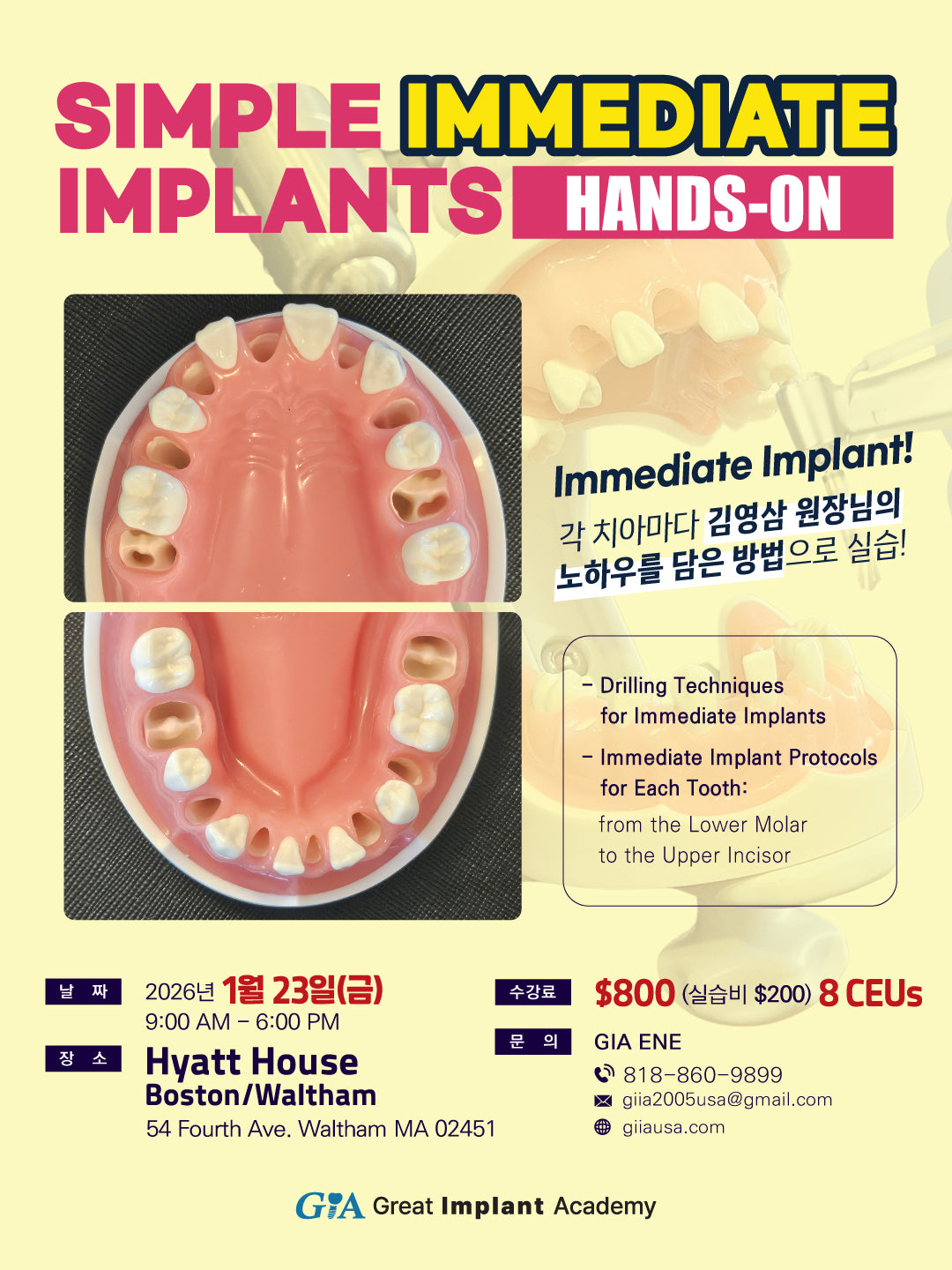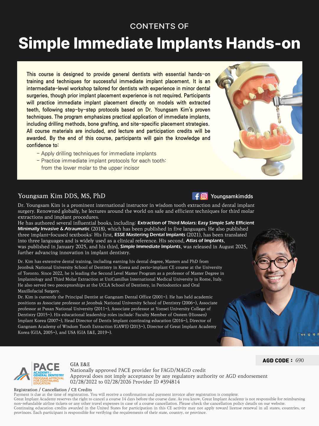 This course is designed to provide general dentists with essential hands-on training and techniques for successful immediate implant placement. It is an intermediate-level workshop tailored for dentists with experience in minor dental surgeries, though prior implant placement experience is not required. Participants will practice immediate implant placement directly on models with extracted teeth, following step-by-step protocols based on Dr. Youngsam Kim’s proven techniques. The program emphasizes practical application of immediate implants, including drilling methods, bone grafting, and site-specific placement strategies.