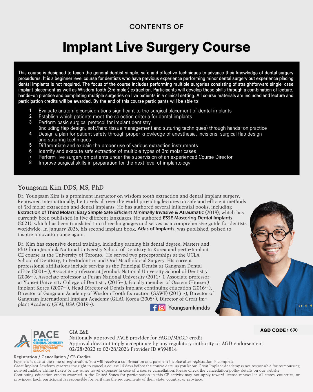 Dr. Youngsam Kim is a prominent international instructor in wisdom tooth extraction and dental implant surgery. Renowned globally, he lectures around the world on safe and efficient techniques for third molar extractions and implant procedures. He has authored several influential books, including: Extraction of Third Molars: Easy Simple Safe Efficient Minimally Invasive Atraumatic (2018), which has been published in five languages. He also published three implant-focused textbooks: His first, ESSE Mastering Dental Implants (2021), has been translated into three languages and is widely used as a clinical reference. His second, Atlas of Implants, was published in January 2025, and his third, Simple Immediate Implants, was released in August 2025, further advancing innovation in implant dentistry.