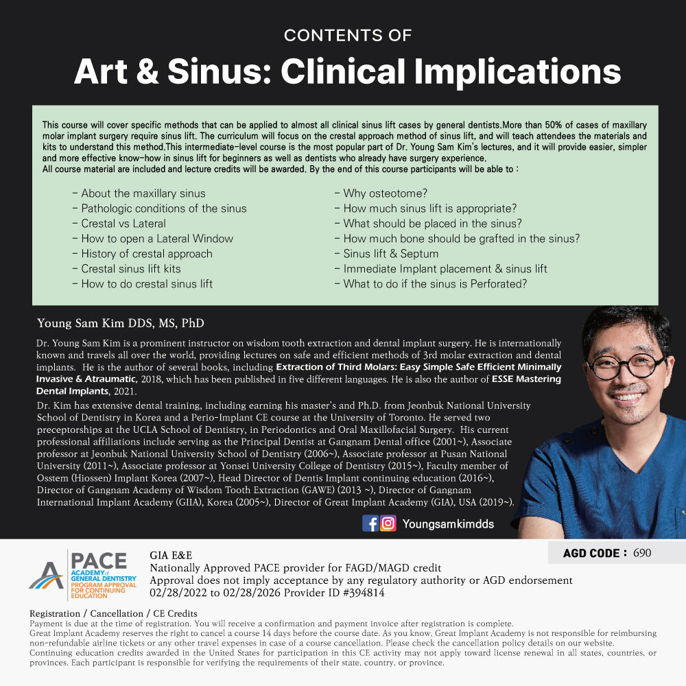 This course will cover specific methods that can be applied to almost all clinical sinus lift cases by general dentists. More than 50% of maxillary molar implant surgery cases require a sinus lift. The curriculum will focus on the crestal approach method of sinus lift and will teach attendees the materials and kits needed to understand this method. This intermediate-level course is the most popular part of Dr. Young Sam Kim's lectures and will provide easier, simpler, and more effective know-how in sinus lift techniques for beginners as well as dentists who already have surgical experience.